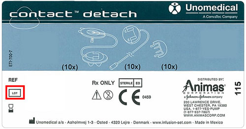 If you or someone you care for uses Contact Detach infusion sets, check the box or pouch labels to see if you have an affected device. These labels include a reference number relating to the lot number.