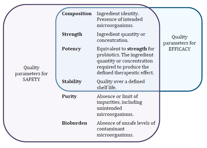 Efficacy is the capacity for therapeutic effect. The efficacy of a probiotic medicine depends on the presence of one or more specific therapeutically active ingredients in sufficient quantities over the shelf life of the medicine. As such, controlling the quality parameters in Figure 1 is critical for ensuring efficacy.