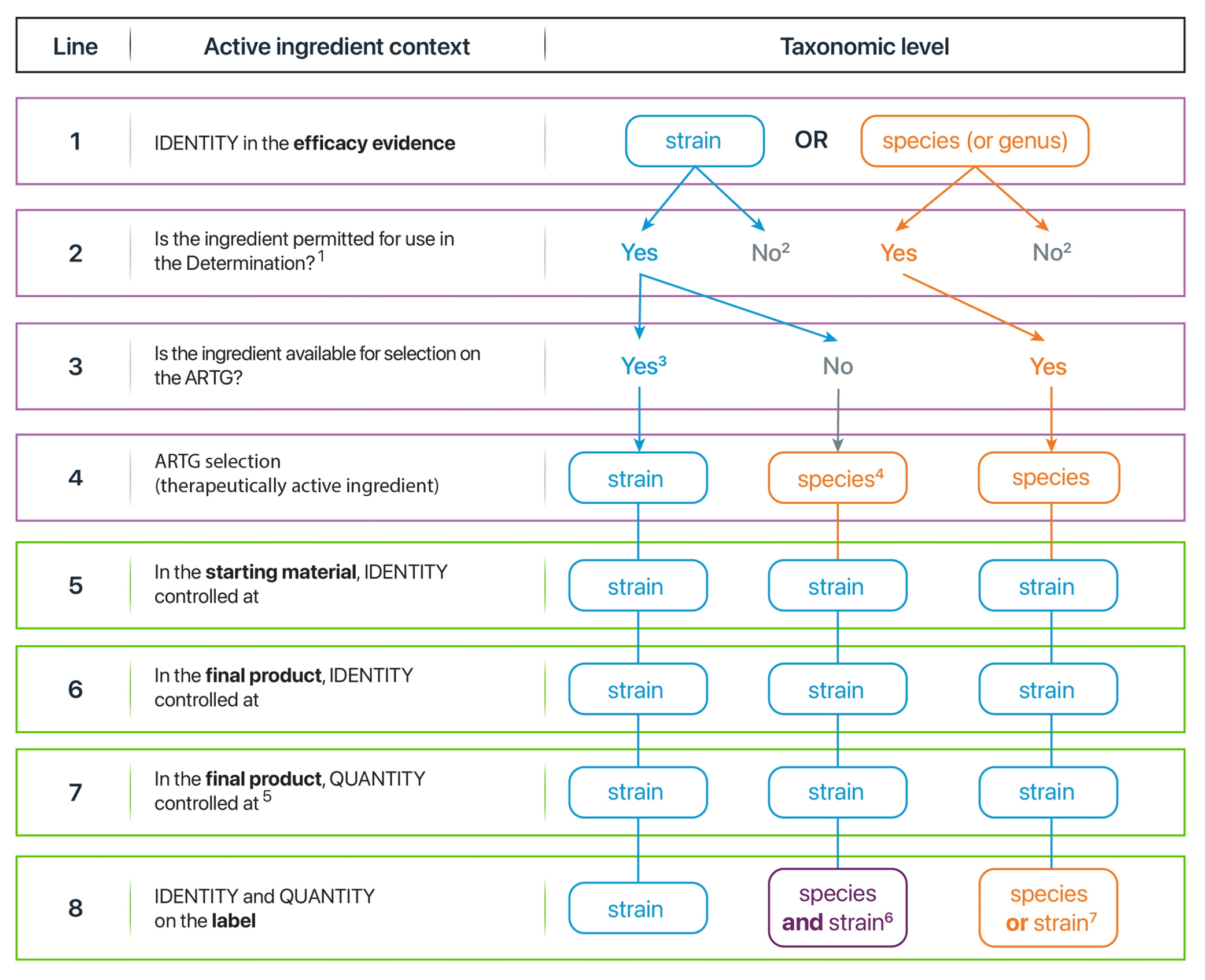 The ingredient in a probiotic medicine that is responsible for efficacy and stated in the information or evidence held by the sponsor (e.g. a clinical trial), is usually identified at the strain level; although, efficacy could potentially be attributed to a species or higher taxon. If a probiotic medicine’s efficacy is not strain specific (i.e. instead it is species specific), then any strain in that species could confer the same therapeutic effect, and thus any strain in that species could be an ingredient responsible for efficacy in the medicine. Similarly, if the medicine’s efficacy is genus specific, then any species (and strain within those species) could confer the same therapeutic effect and thus any species (and strain) in that genus could be an ingredient responsible for efficacy in the medicine.