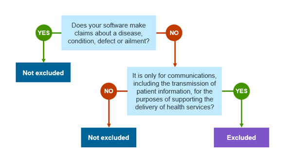 | Supporting the delivery of health services | Software to transmit patient information with the goal of helping to deliver some sort of health service. There are many types of health service that can be delivered remotely via a telehealth service – anything from the results of a test or scan (information only) to advice on what disease a patient might have (diagnosis), what the patient's chances are of recovery (prognosis) or step-by-step guidance to perform an emergency procedure in a remote location (treatment). If the software only facilitates the communication, then it is excluded, even if a health professional using it might be diagnosing or treating a patient. However, if the software makes claims about a disease, condition, ailment, or defect, it may not be excluded. For example, if software intended to support communications also included functionality that analysed patient information (such as imaging and test results) to detect a particular condition, it would not be excluded. |
