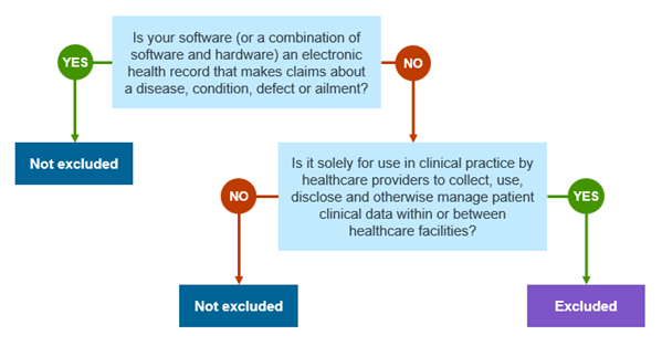 If the answer is NO, the process moves to a second question: "Is it solely for use in clinical practice by healthcare providers to collect, use, disclose, and otherwise manage patient clinical data within or between healthcare facilities?"