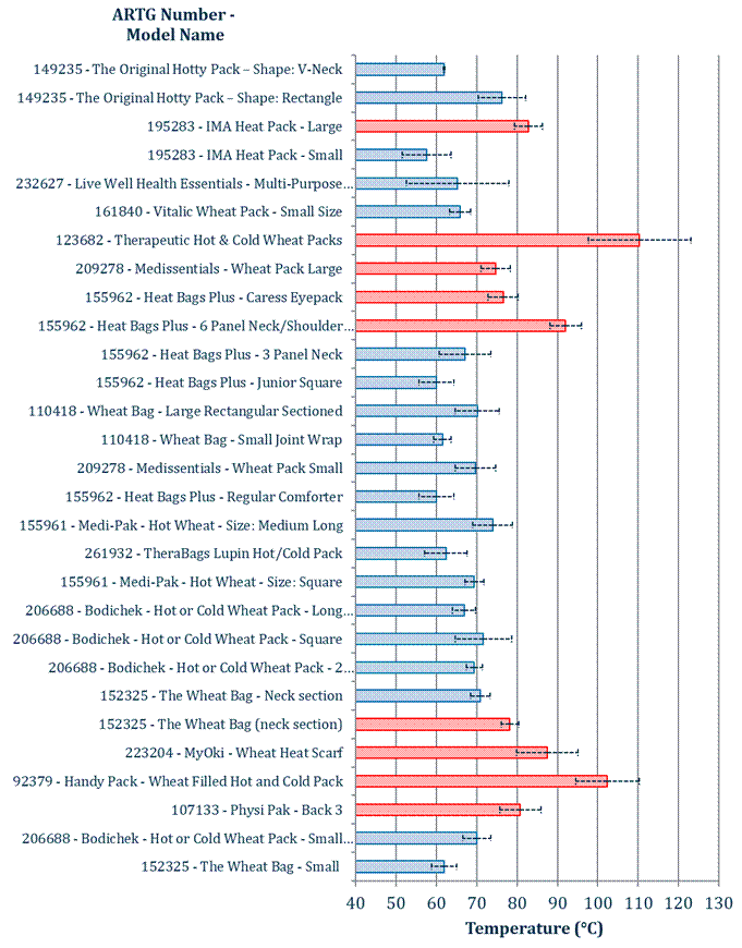 Figure 2 provides the results from measuring the maximum filling temperature of the packs after heating according to the manufacturer's instructions for use. The result presented in the graph for each model type is the average of three testing heat packs. Error bars indicate the standard deviation, i.e. a measure of the variation in filling temperatures recorded between the three packs. This variation in filling temperature is generally related to how accurately manufacturers control their fill volumes, the natural variation in the fill's properties, and how accurately the temperature probe is placed into the centre of the filling mass to record the temperature. A 'fail' result - indicated in red - occurred when all three packs tested recorded a maximum filling temperature exceeding 70°C.