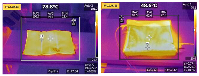 The surface temperature of the heat pack was measured using a thermal imaging camera after heating according to the manufacturer's instructions for use. The results showed that typically the maximum temperature would be localized at a seam of the heat pack, either between pockets (Figure 3 - Left) or on the edge (Figure 3 - Right). The non-uniform temperature gradient of the heat pack surface makes it difficult to represent the surface temperature with a single value as required by AS/NZS 5116:2016 (the requirement of the Standard is that the surface temperature cannot exceed 50°C). Additionally, the surface temperature profile of the heat pack is dependent on its position within the microwave. None of the models tested in this study recorded a maximum surface temperature less than 50°C; for 24 of the 29 samples, the maximum surface temperature was greater than the maximum filling temperature.