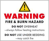 - When selecting a microwavable heat pack, consumers are advised to ensure fire and burn hazard warning labels are present instructing the user not to overheat, and not to use under bedding. Heating instructions should always have a microwave power (i.e. 1000 W) associated with the microwave time.