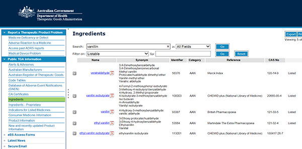 - Type ingredient name in the search box. For example, 'vanillin' and press the 'GO' button.