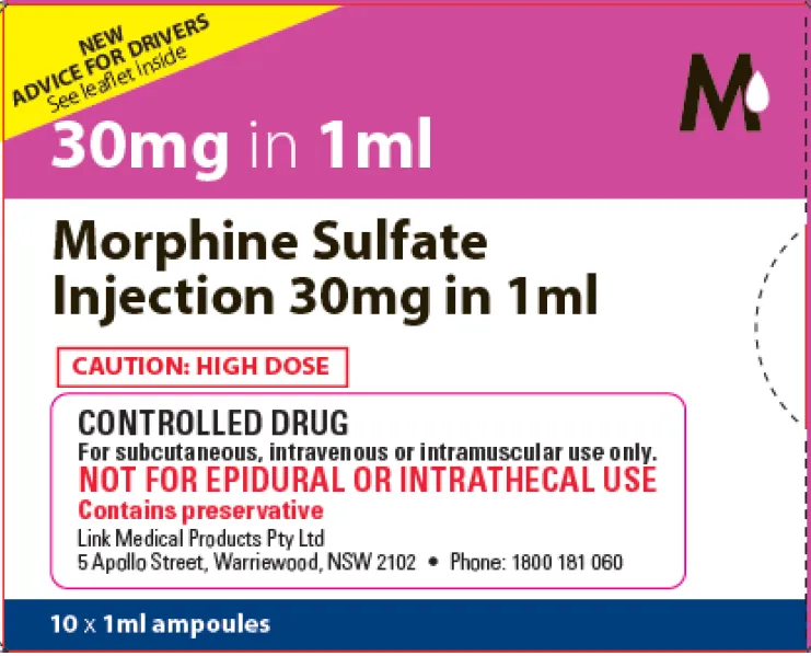 MORPHINE SULFATE INJECTION BP 30mg in 1mL, ampoule contains preservative therefore it is not to be used for either epidural or intrathecal routes. A safety advisory regarding this issue is available at https://www.tga.gov.au/alert/morphine-sulfate-injection-bp-30-mg-1-ml-a….