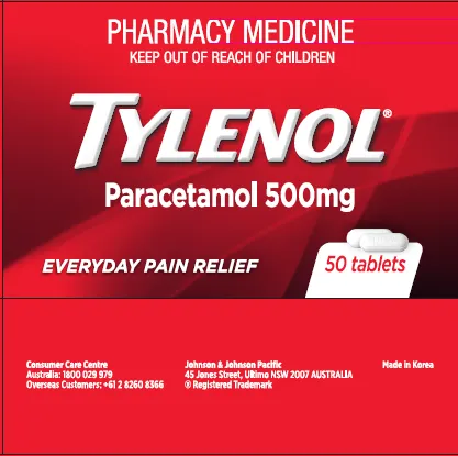 TYLENOL paracetamol 500mg tablets are to be supplied via pharmacies. The blister platform paper backing for this product states acetaminophen 500 mg. Please be aware that paracetamol is known by actetominophen in some countries. A statement on the carton has been included.