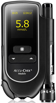 The Accu-Chek Mobile blood glucose meter, pictured, is used by people receiving insulin therapy to monitor their blood glucose levels.
