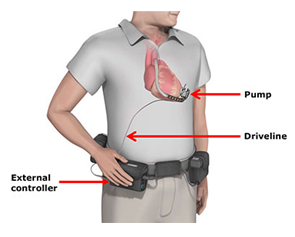 The HVAD system takes over some or all of the pumping function of the heart. The device includes a pump which is attached to the patient's heart and is connected via a driveline to an external controller that regulates the pump's function and monitors the system. The system is implanted either in patients awaiting heart transplants or as an alternative to transplantation.